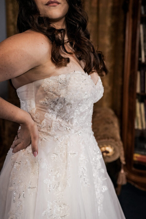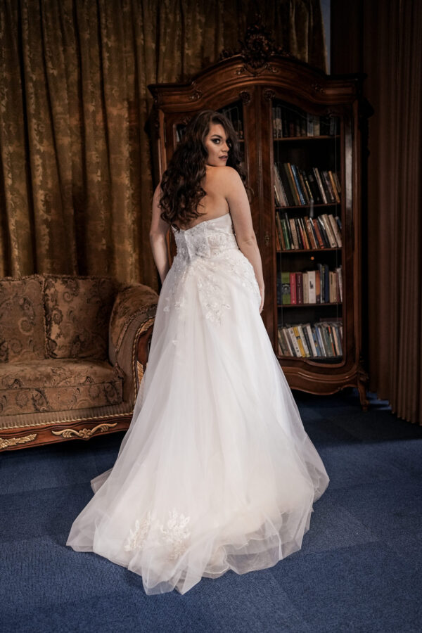 Zdobienia tej sukni to prawdziwe dzieła sztuki, misternie wykonane przez rzemieślników, którzy dbają o najdrobniejsze detale. Kryształy, perły, hafty, koronki – każdy element sukni przyciąga uwagę i tworzy spektakularny efekt, który zachwyci wszystkich obecnych na Twoim ślubie.