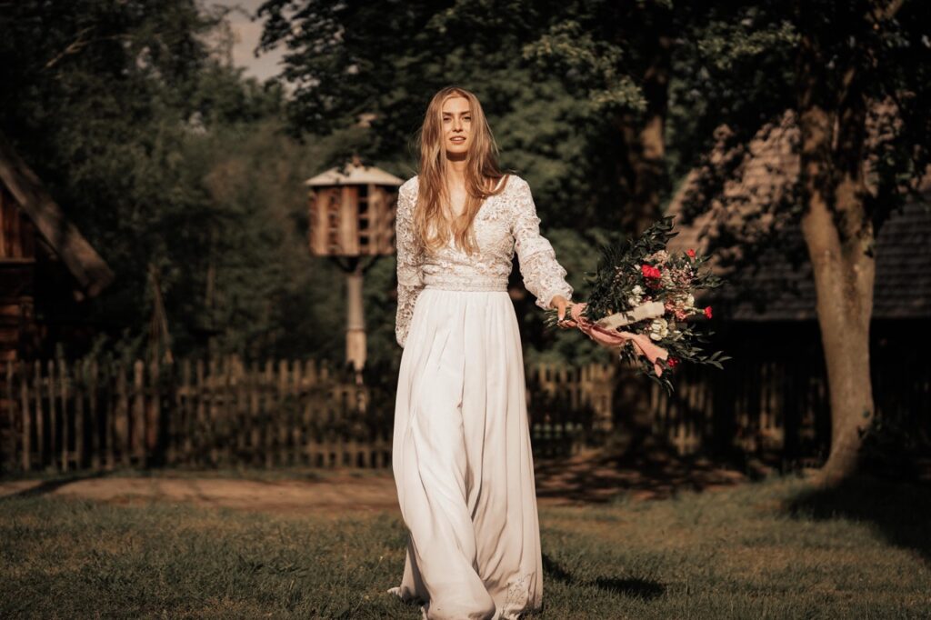 Nietypowa suknia ślubna Grace z rękawami. Suknia ślubna z lekką spódnicą i koronkową górą w stylu boho. Góra sukni ślubnej Grace uzupełniona jest długimi koronkowymi rękawami tworząc przepiękną kompozycję. Plecy sukni ślubnej ozdobione są rzędem funkcjonalnych guzików oraz wycięciem w kształcie litery V. Lejąca spódnica sukni ślubnej Grace w kształcie litery A podkreśla lekkość i subtelność. Suknia ślubna, która urzeka swoją prostotą i efektowną, koronkową górą.