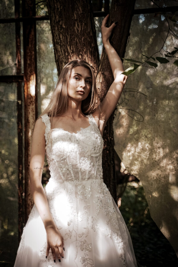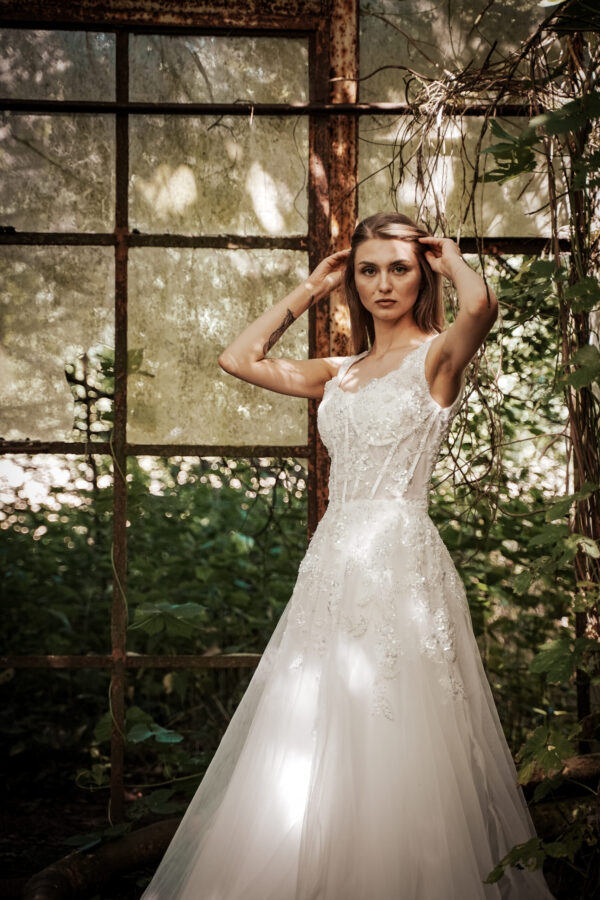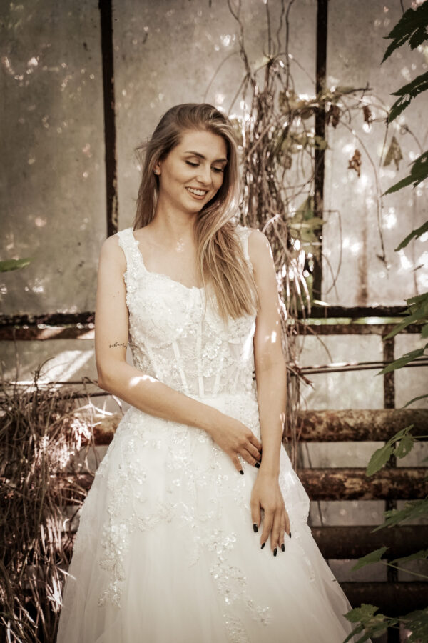 Wybierz subtelność i kobiecy urok w naszej sukni ślubnej „Kylie” z transparentnym gorsetem. Ta delikatna sukienka emanuje wyjątkowym wdziękiem i elegancją, zapewniając Ci niezapomniany wygląd w dniu Twojego ślubu.