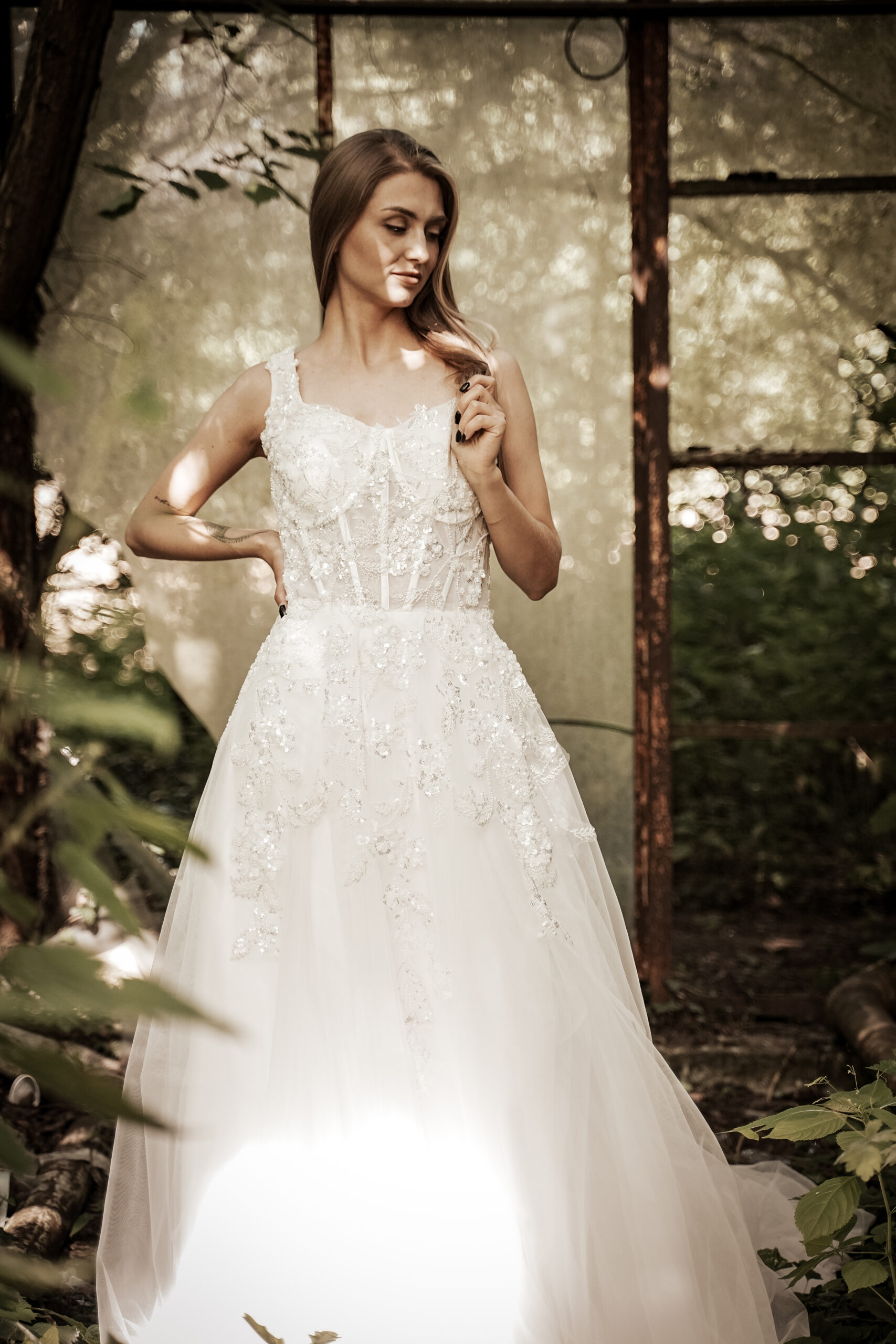 Transparentny gorset sukni Kylie dodaje niezwykłej lekkości i subtelności całej stylizacji. Delikatne zdobienia lub hafty na gorsecie tworzą wyjątkowy wzór, który subtelnie podkreśla kobiecą sylwetkę, jednocześnie dodając jej uroku i wyrafinowania.