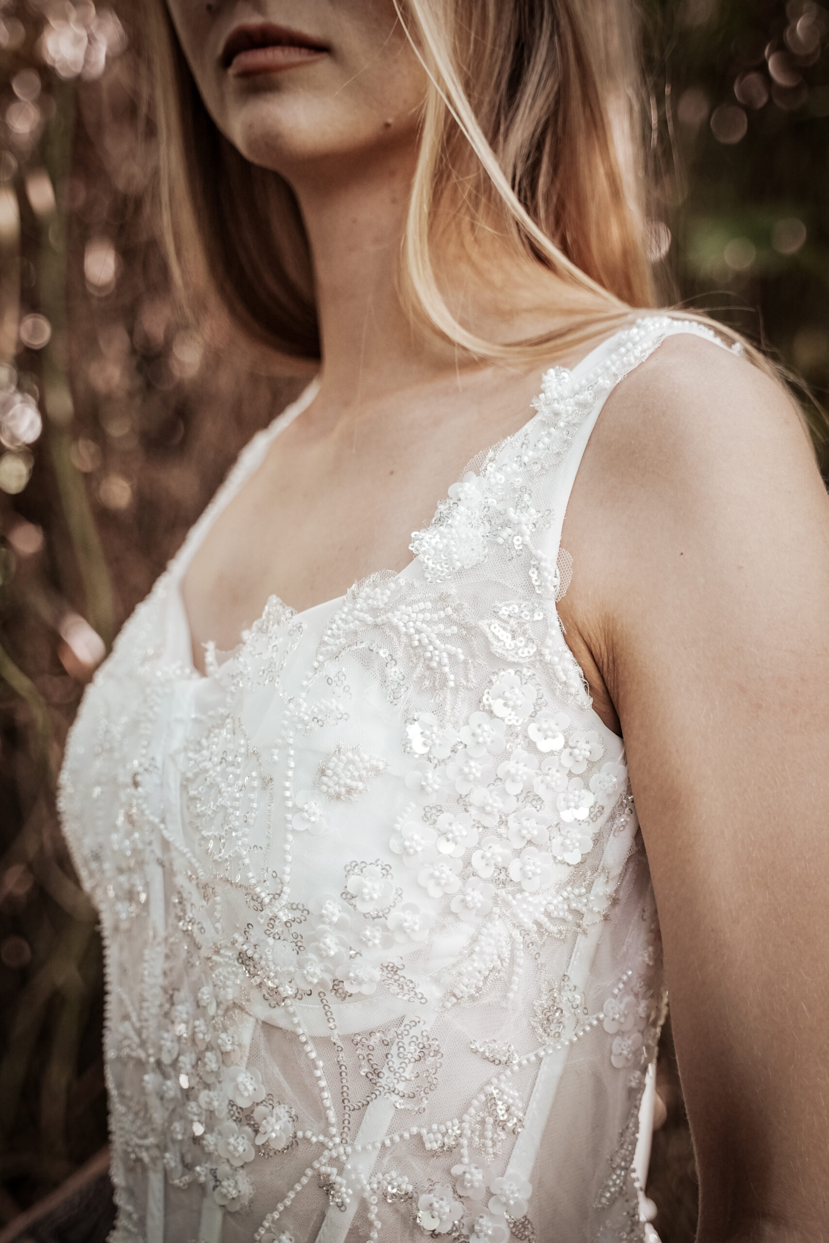 Delikatna i kobieca suknia ślubna Kylie z transparentnym gorsetem. Suknia ślubna zdobiona dekoracjami 3d w formie wzoru kwiatowego, który łączy gorset sukni ślubnej Kylie z odciętą w pasie spódnicą. Suknia ślubna z ramiączkami oraz efektownym i nowoczesnym dekoltem karo. Dziewczęca suknia ślubna Kylie, która urzeka każdą Pannę Młodą swoją delikatnością oraz możliwością dopasowania do każdego stylu wesela.