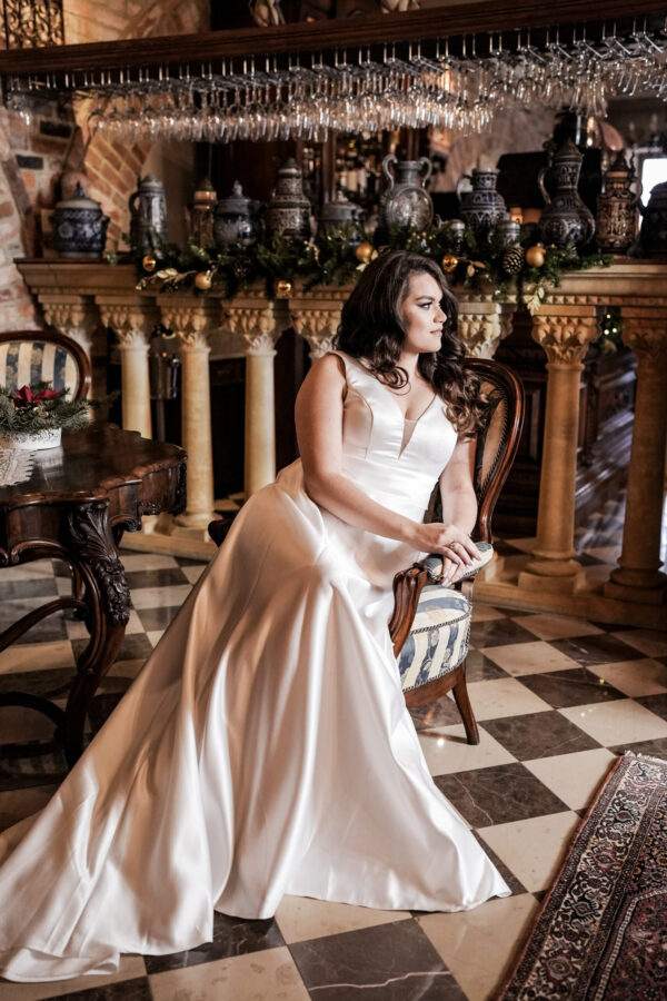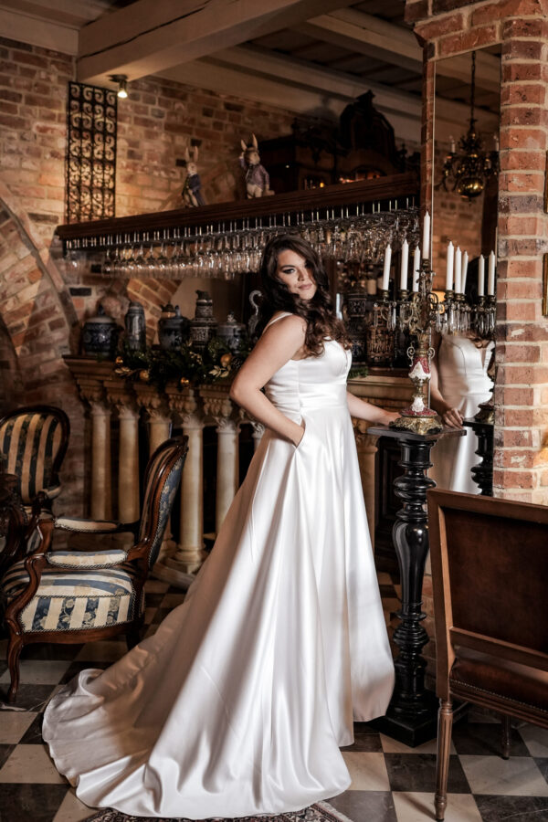 Uniwersalność fasonu sprawia, że suknia ślubna Margaret sprawdzi się zarówno podczas ślubu w stylowym wnętrzu pałacowym, jak i na romantycznej ceremonii w plenerze. Klasyczny krój i subtelna forma pasują do wielu stylów weselnych, od eleganckiego glamour po rustykalną prostotę. To model, który zachwyca nie tylko na żywo, ale także w obiektywie aparatu – co czyni go idealnym wyborem na niezapomnianą sesję zdjęciową.