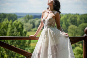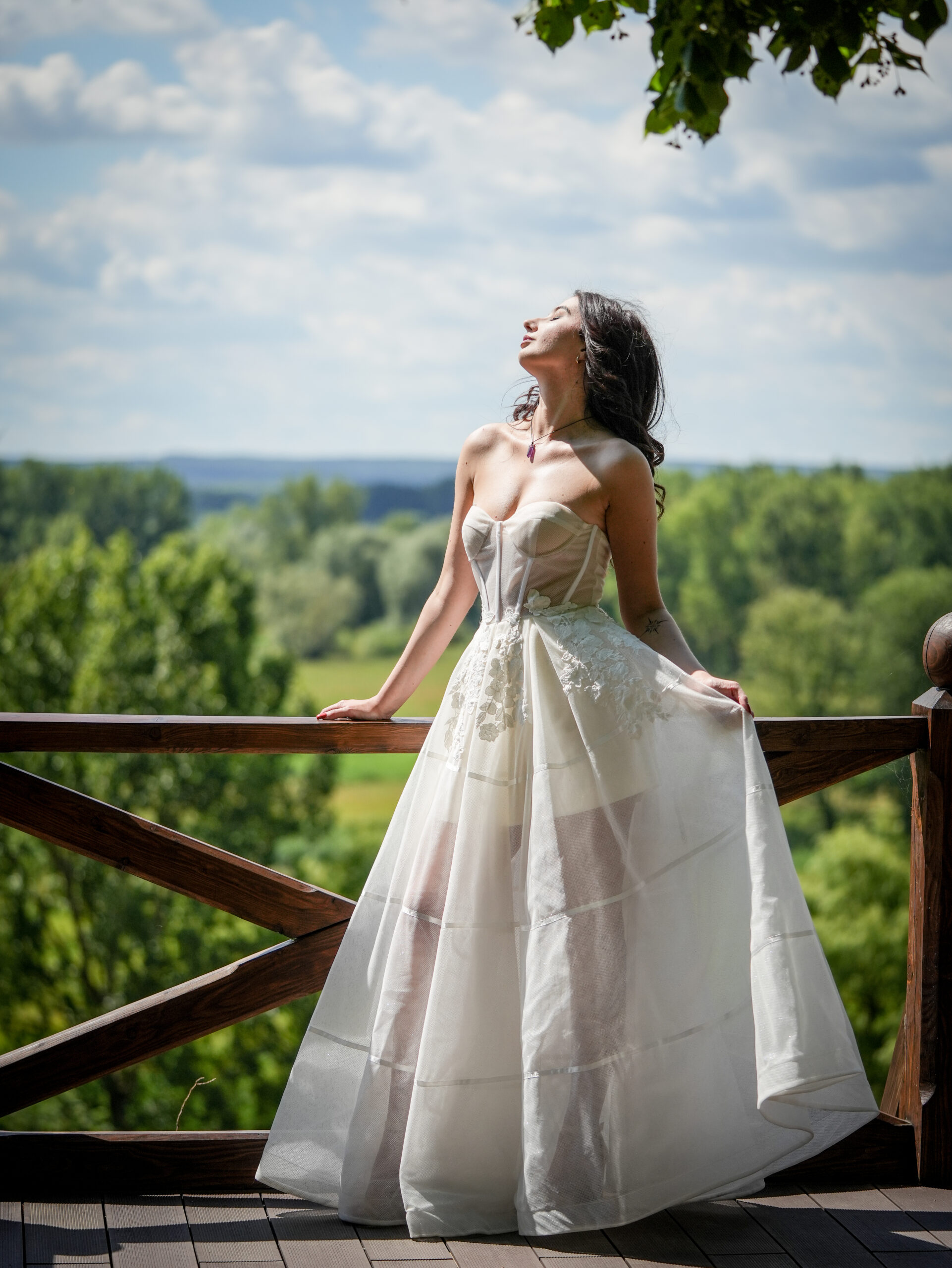 Transparentna i błyszcząca suknia ślubna Perfetto, która jest prawdziwym dziełem sztuki. Ta transparentna, błyszcząca suknia ślubna zachwyca delikatnością i elegancją. Wykonana z lekkiego, przezroczystego materiału, subtelnie otula sylwetkę panny młodej, podkreślając jej wdzięk i kobiecość. Suknia ślubna Perfetto jest bez ramiączek, co nadaje jej zmysłowego i romantycznego charakteru, eksponując ramiona i dekolt.