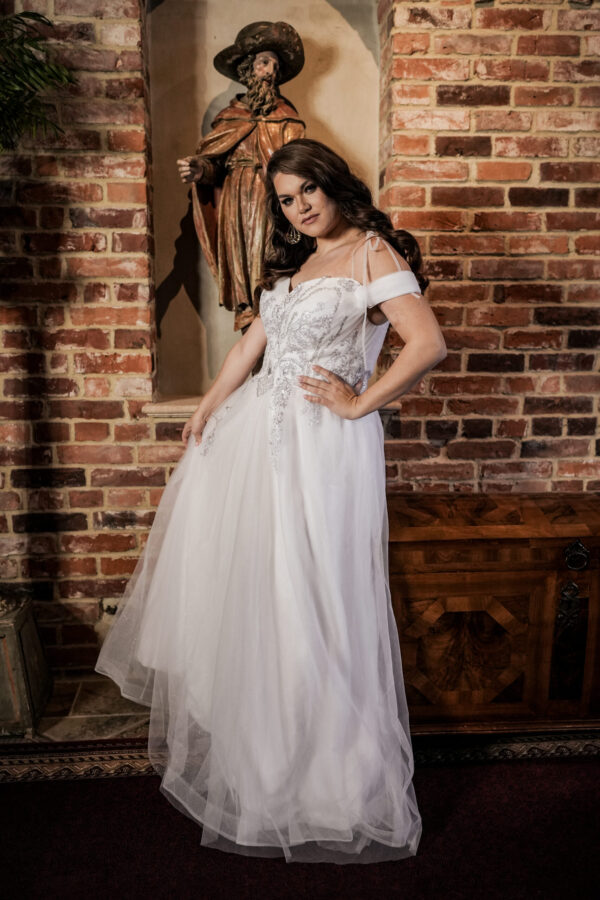 Przenieś swoją stylizację na wyższy poziom romantyzmu i wyrafinowania w naszej sukni ślubnej z bogato zdobionym gorsetem, który ozdobiony jest w kształcie serca. Ta wyjątkowa sukienka łączy w sobie elegancję z subtelnym urokiem, tworząc niezapomniany wygląd na Twój dzień ślubu.