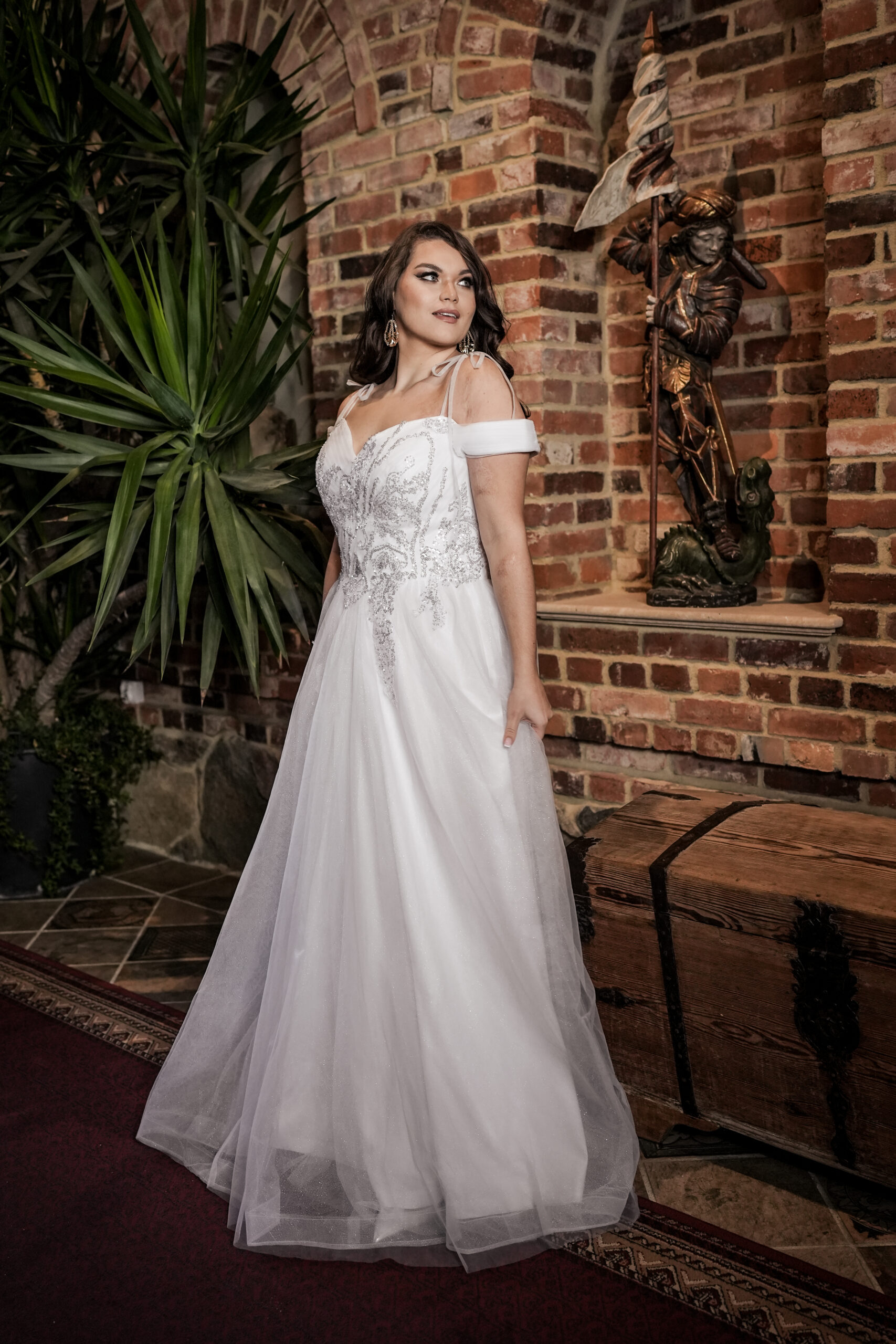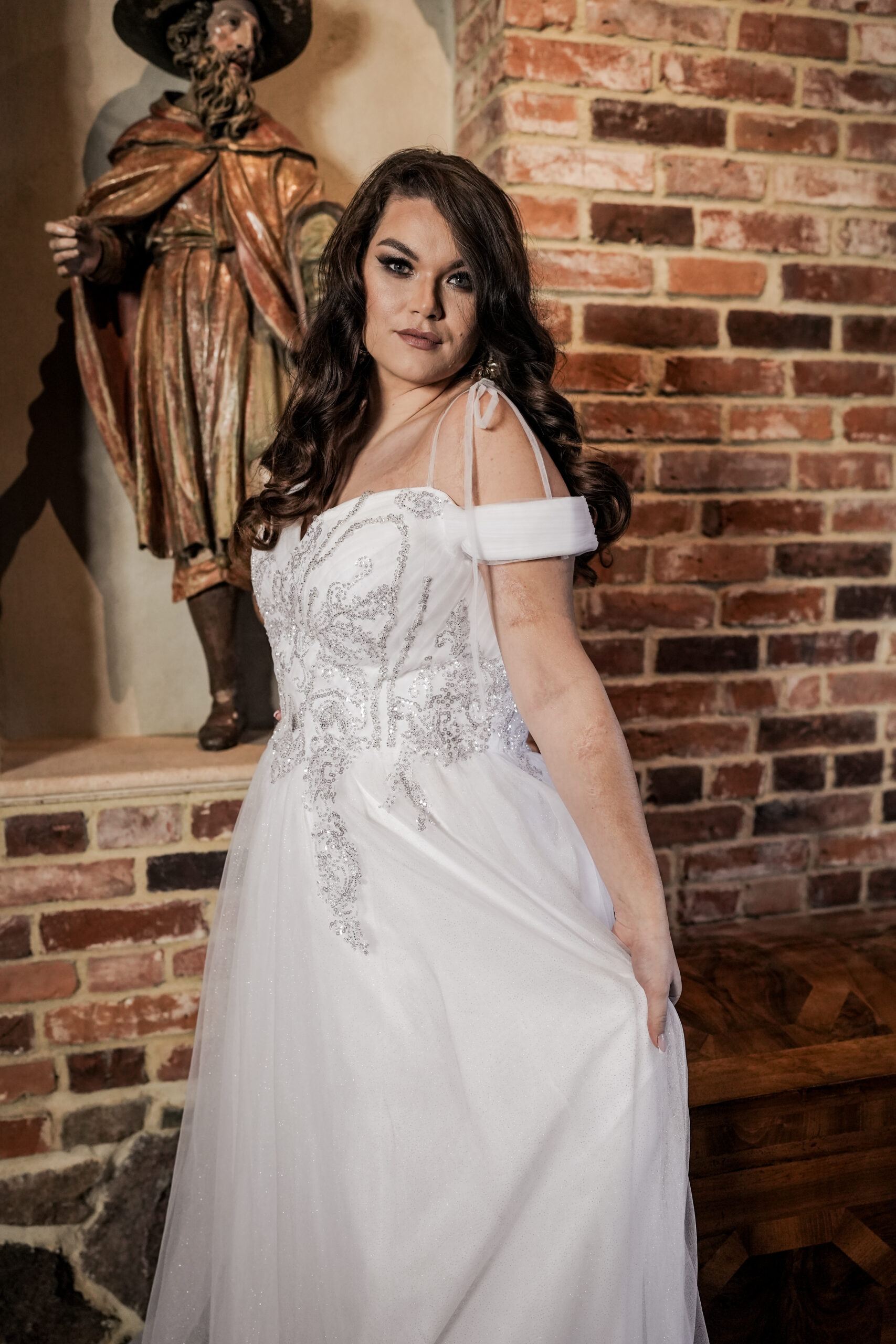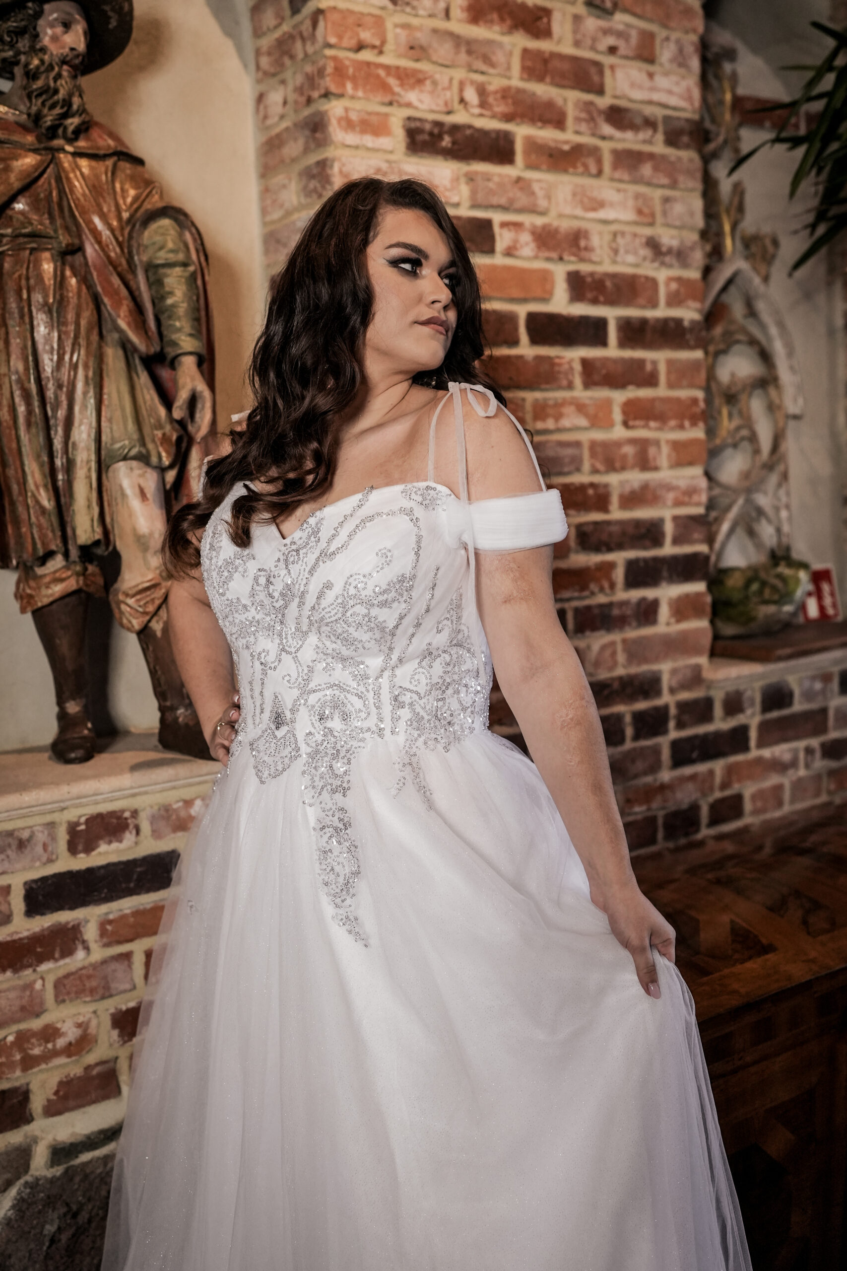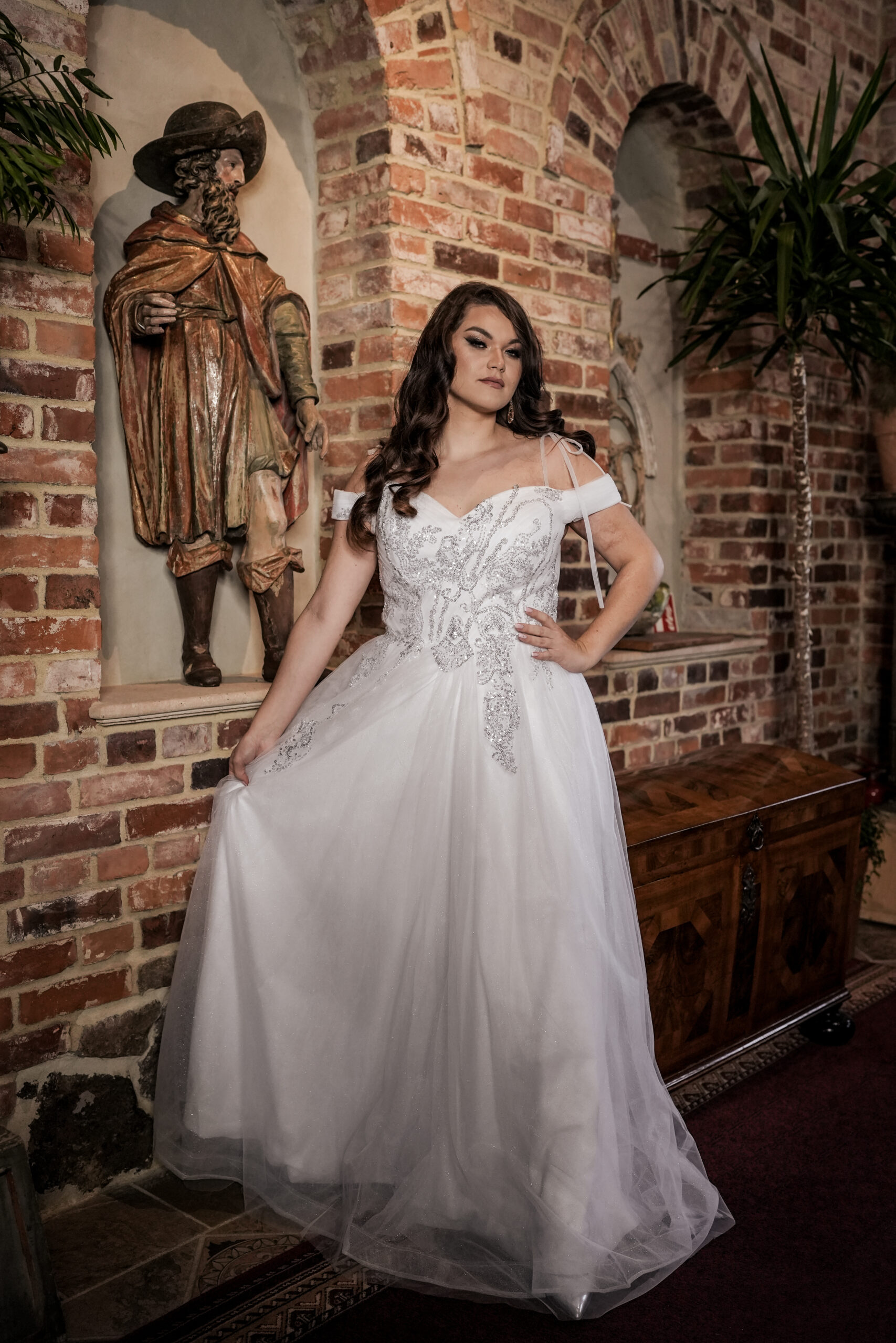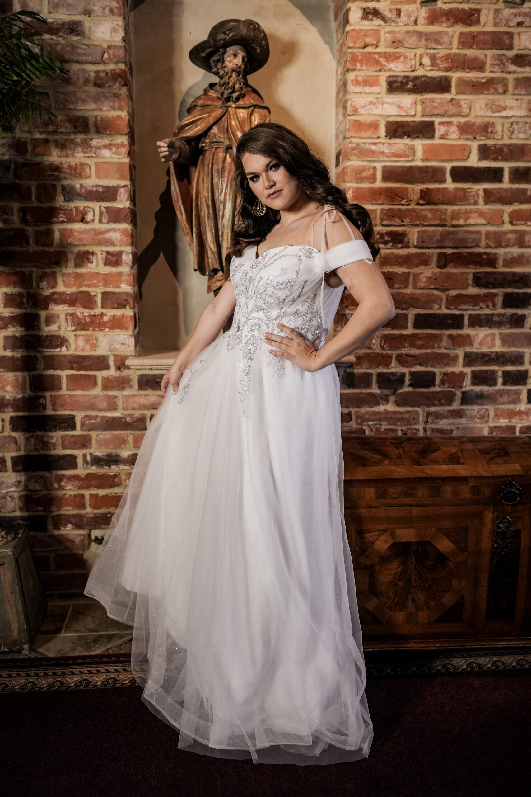 Na wizytę zabierz docelowe buty – dopasujemy długość tak, by warstwy tiulu harmonijnie falowały. Sprawdzimy też ułożenie ramiączek i podparcie gorsetu, aby zapewnić komfort od ceremonii po pierwszy taniec.
