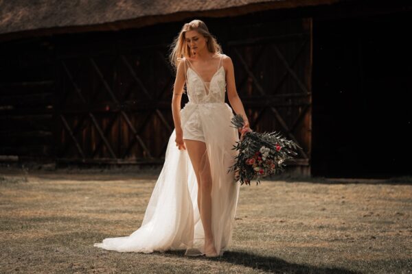 Stylowa suknia ślubna Saanvi z głębokim dekoltem oraz bogatymi zdobieniami. Suknia ślubna na zdobionych, wiązanych ramiączkach z dekoltem v-neck, która pięknie eksponuje kobiece atuty. Suknia ślubna Saanvi z krótką spódnicą otoczoną długim i rozłożystym trenem, będzie bardzo dostojnie prezentować się przed ołtarzem. Imponujący dekolt na plecach, to kolejny atut sukni ślubnej, która wyróżnia się elegancją oraz odwagą.
