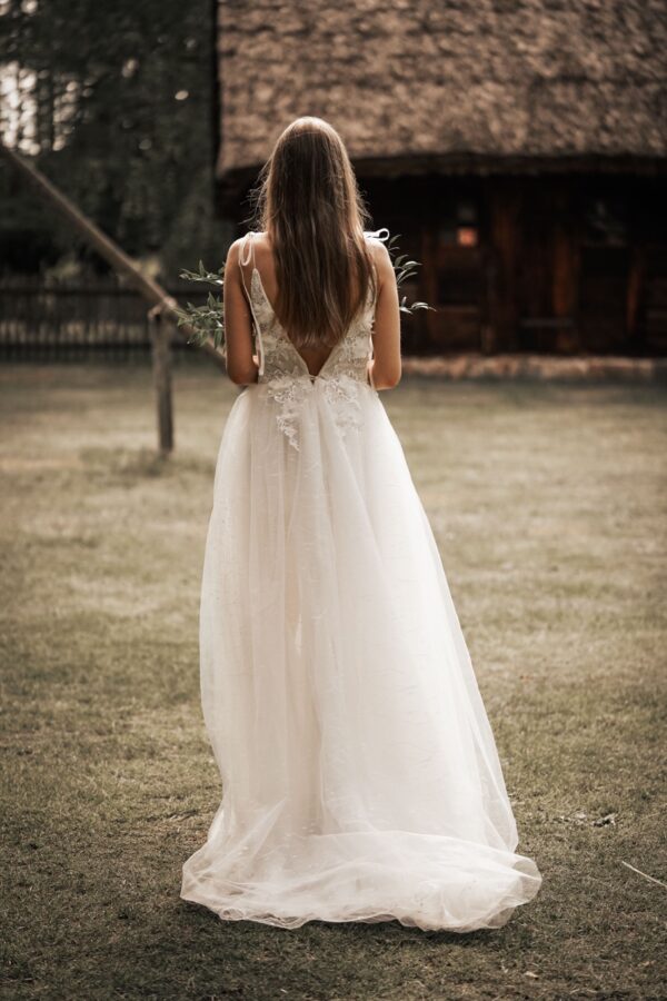 Spódnica sukni, w delikatnym kroju princessy lub syreny, tworzy efektowny i majestatyczny wygląd. Lekka tkanina sprawia, że każdy krok staje się jak taniec, dodając sukni niezwykłego uroku i splendoru. Elegancja i luksus są tutaj kluczem do osiągnięcia harmonii i piękna.