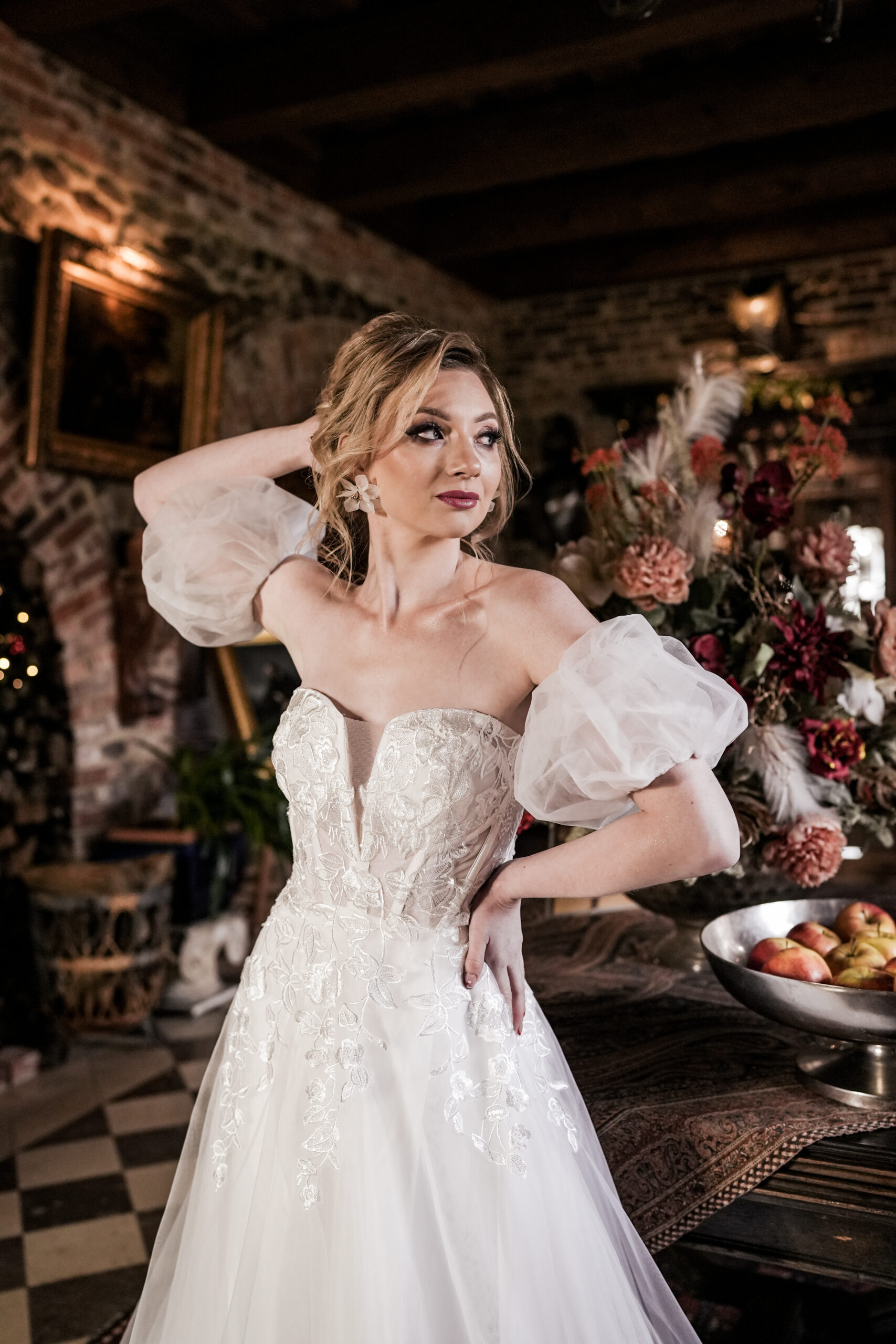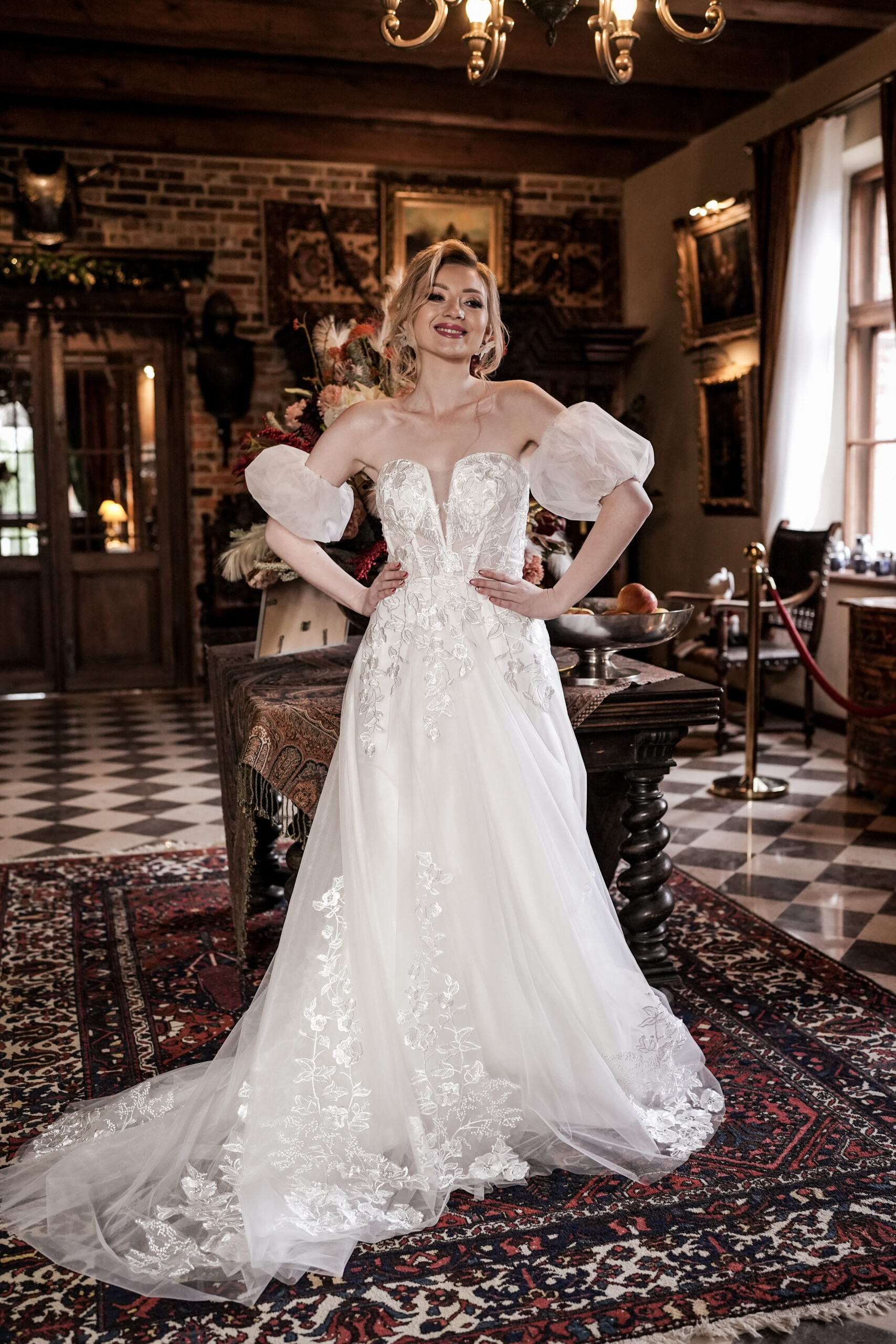 Na wizycie sprawdź podparcie gorsetu, ułożenie bufek przy ruchu ramion oraz długość z trenem do docelowych butów, aby spódnica harmonijnie falowała.