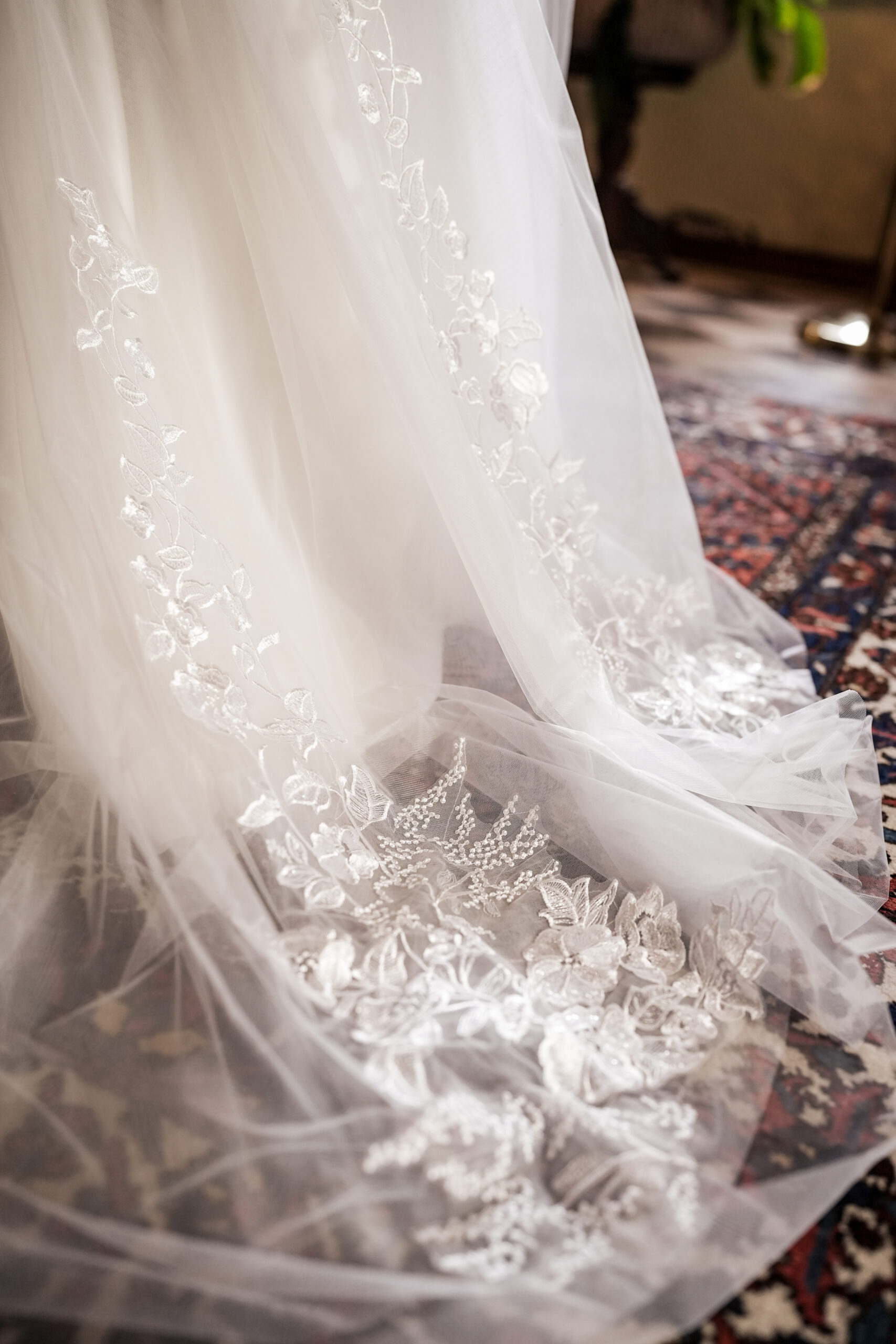 Po uroczystości powierz suknię delikatnemu czyszczeniu profesjonalnemu. Przechowuj w pokrowcu na szerokim wieszaku, dbając o prawidłowe ułożenie aplikacji i trenu.