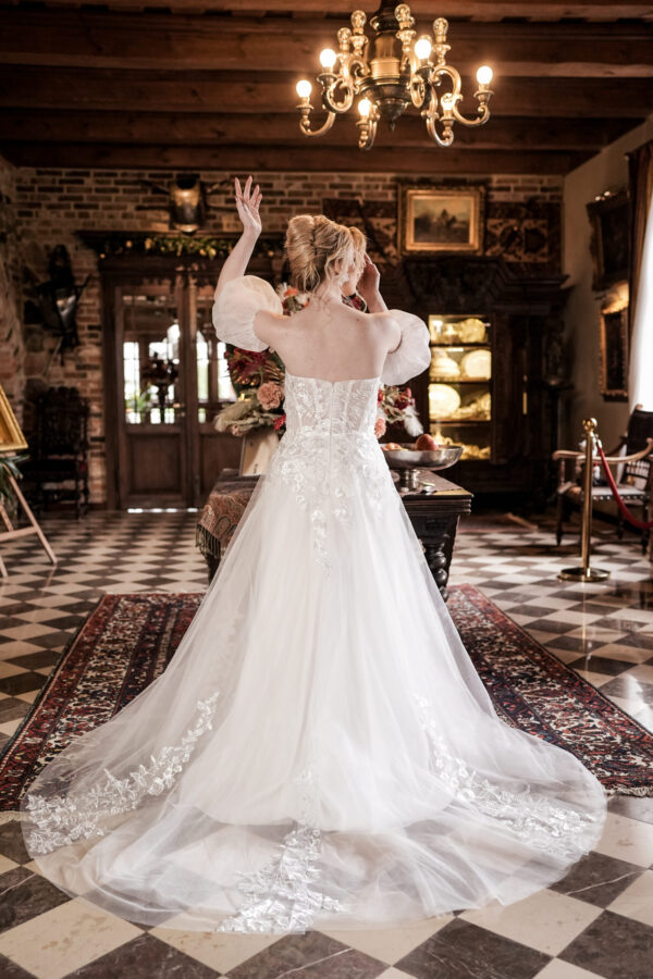 Model Valentine łączy klasyczną konstrukcję z biżuteryjnym detalem. Gorset elegancko podkreśla talię, a bufki na ramionach (off-shoulder) miękko eksponują obojczyki. Błyszczące aplikacje w formie kwiatów są rozmieszczone tak, by rozpraszać się po spódnicy i budować lekkość. Całość wieńczy tren, który daje filmowy efekt wejścia i pięknie wygląda w kadrze.